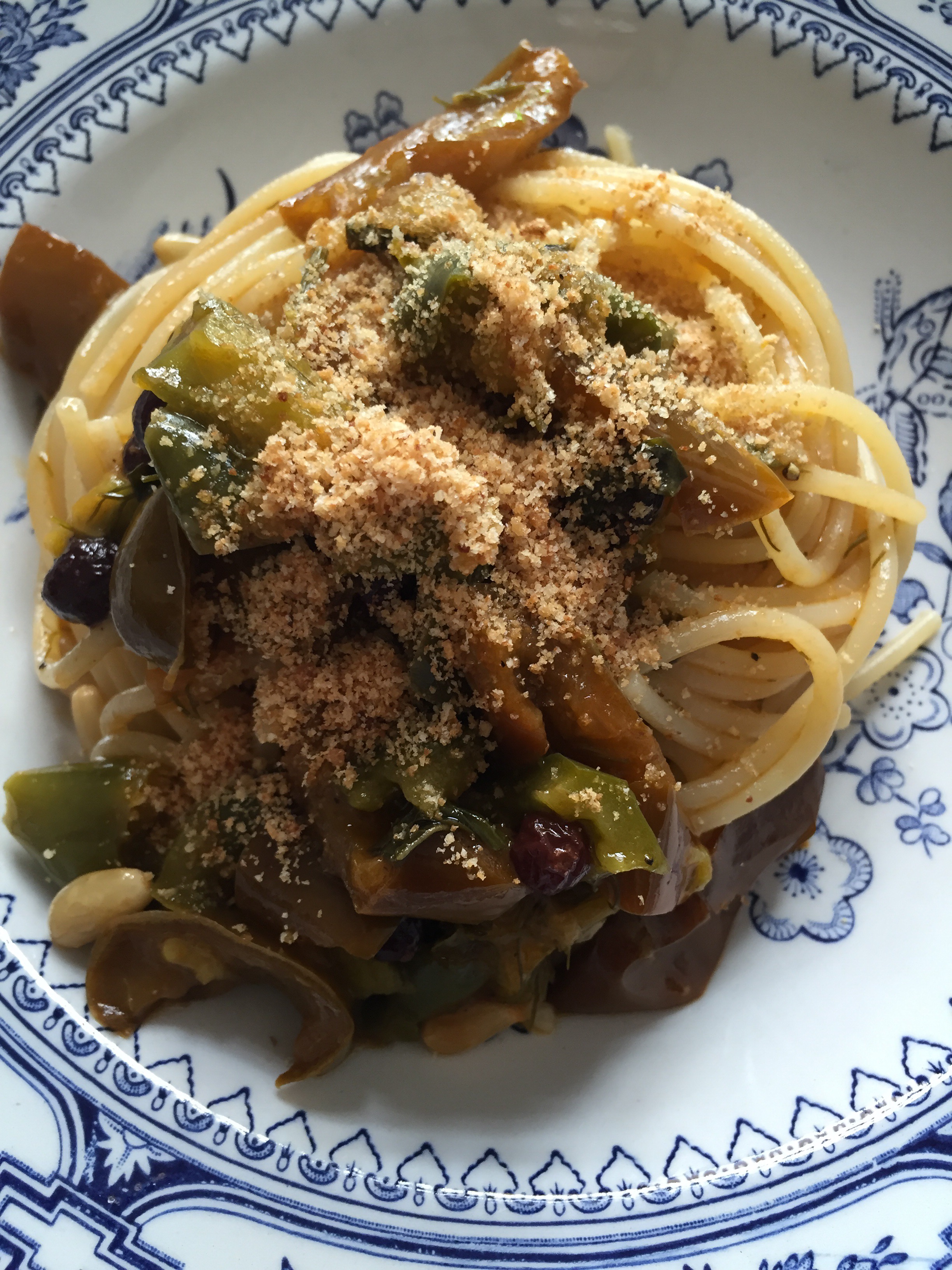 Pasta with sweet peppers, raisins, pine nuts, and bread crumbs