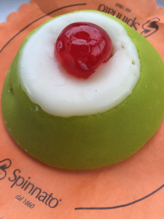 I used to love the Kwality brand cassata ice cream in India, which was sponge cake layered with 3 flavors of ice cream and topped with toasted almonds. Turns out the inspiration is Sicilian cassata: a sponge cake filled with a sweet ricotta-pistachio mixture, covered with marzipan, and decorated with candied fruit. Making one is a labor of love and can take a full day. You can buy individual slices or mini cassatas at most bakeries. There’s also an ice cream version and a pie-like variation called cassata al forno.