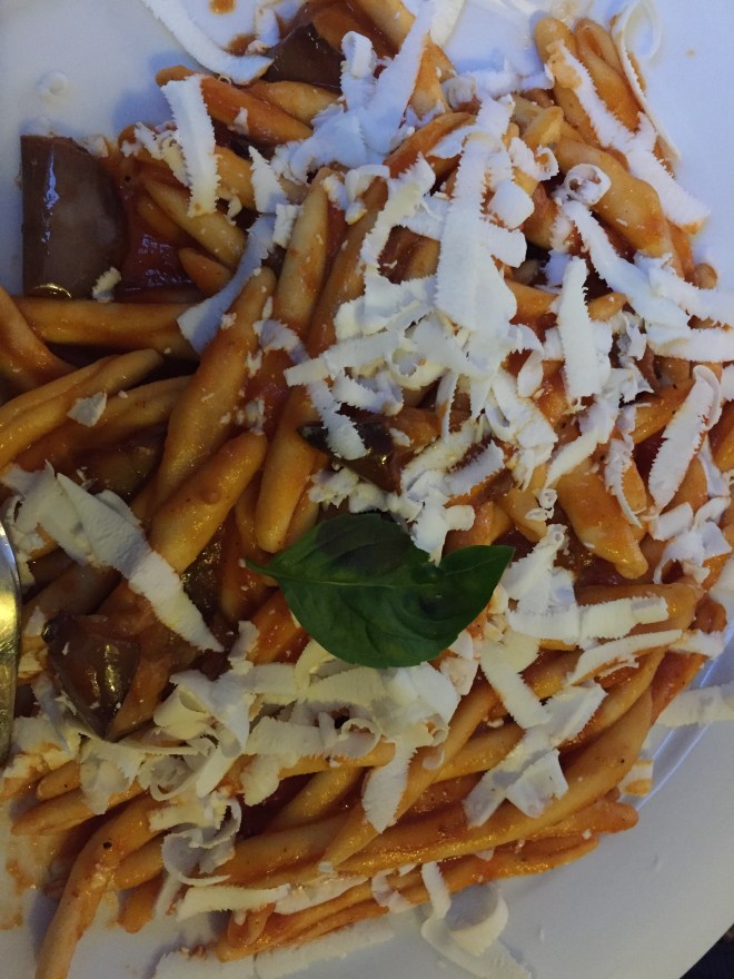 Try Pasta alla Norma: a yummy eggplant tomato and ricotta pasta invented in Eastern Sicily or Pasta alla Trapanese: pasta with a tomato and almond pesto