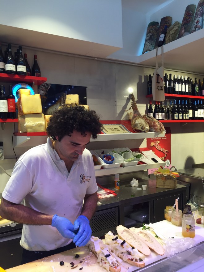 Borderi and his family of sandwich masters chop, sprinkle, and brûlée (yes, brûlée) with the finesse of iron chefs. Borderi was smiling, laughing, and pleasantly chatting with his customers while slicing vegetables and pulling cheese.