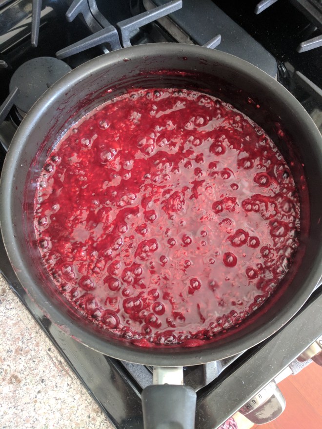 You start with the compote, combining berries and sugar over high heat and thickening with cornstarch.