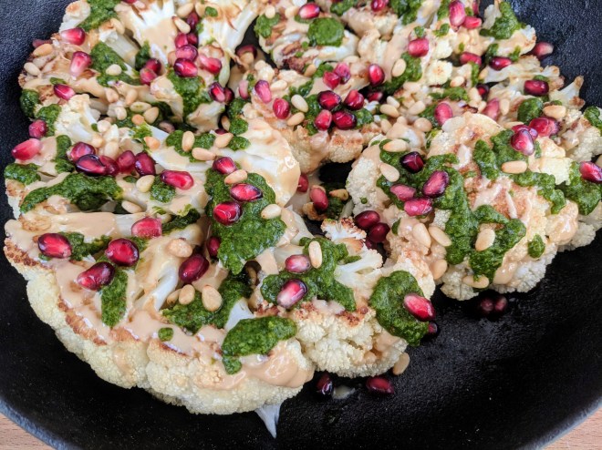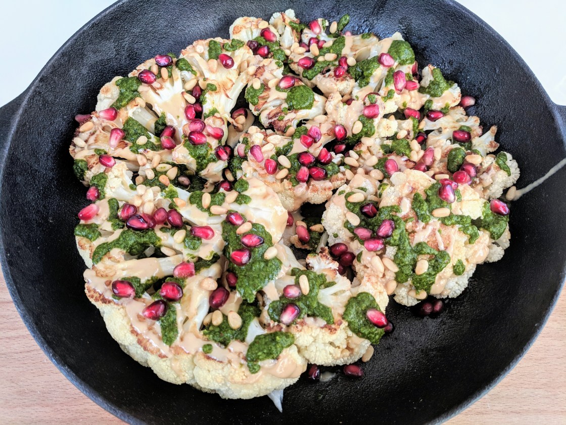 The tahini and chimichurriplay perfectly off each other. The tahini brings richness, the chimichurri brings tartness and heat, and the pomegranate and pine nuts add crunch. Cauliflower is the perfect vehicle for all this flavor because it’s so porous, but I’m sure it would work for other vegetables too.