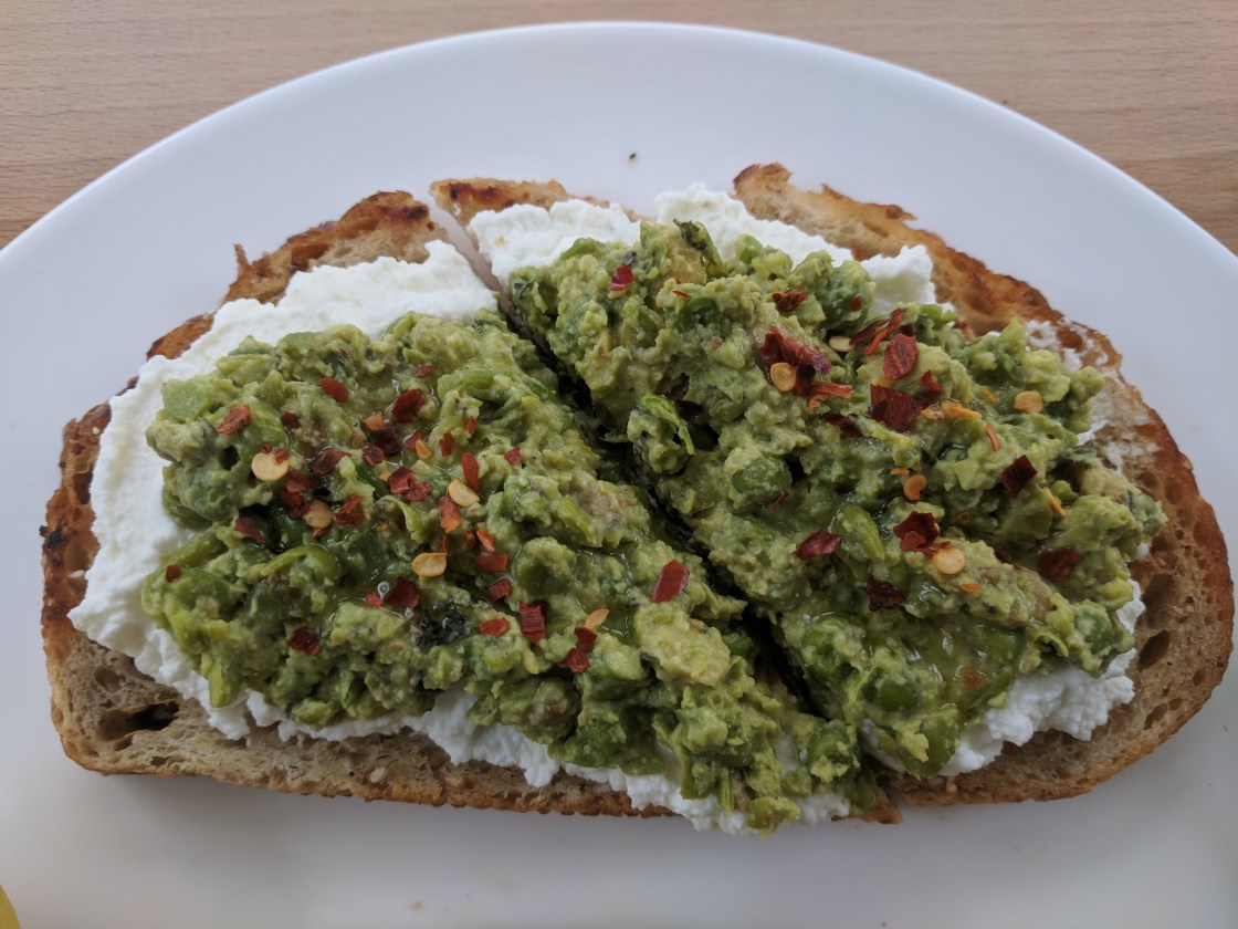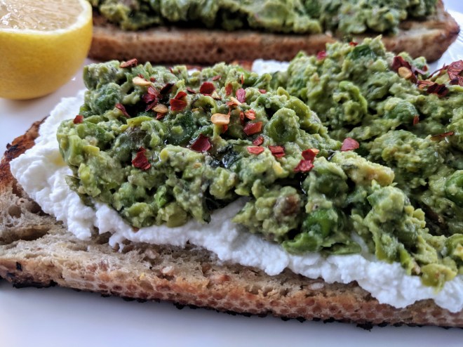 - Spread about 2 tablespoons of ricotta (if using) and 2 tablespoons of pea picture on each slice of bread. Drizzle with olive oil and chili flakes, if desired. Serve immediately.