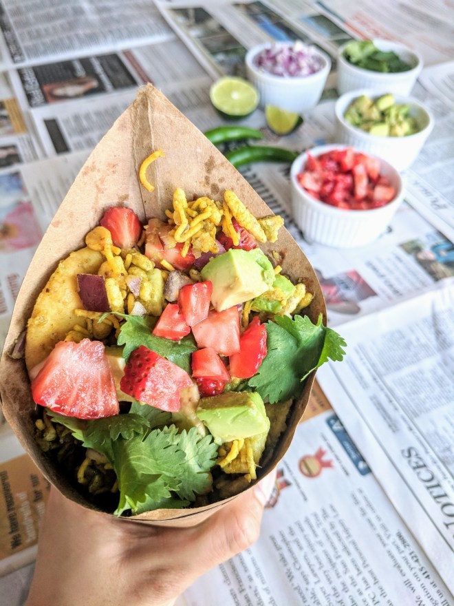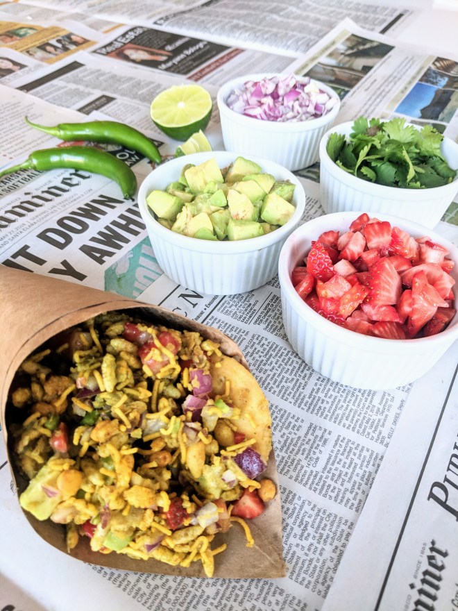 From there, the traditional recipe calls for chilis, cilantro, tomatoes, potato, and the occasional green mango. It’s a perfect blend of crunchy, salty, and sweet.