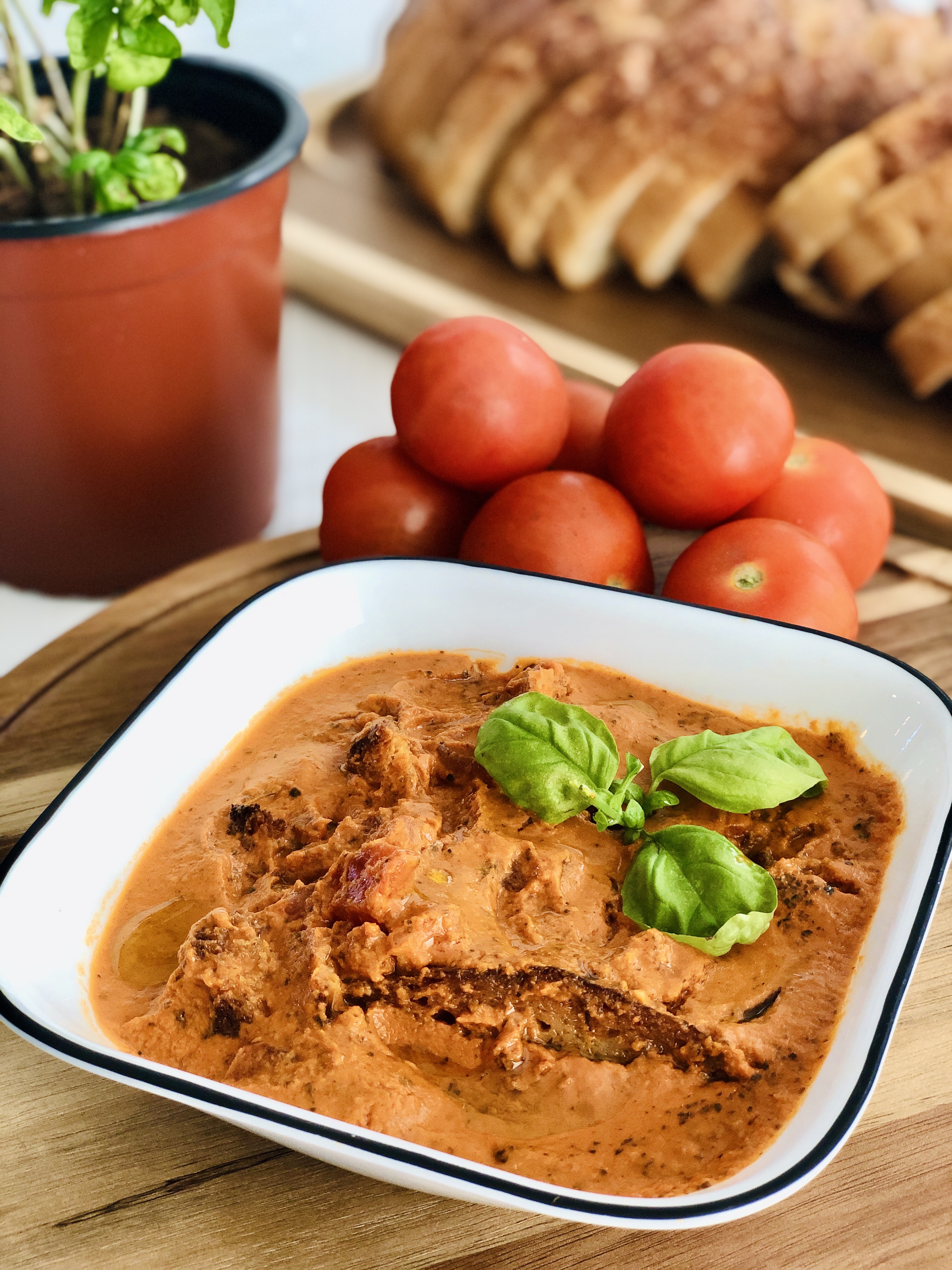 This humble Pappa al pomodoro, or Tuscan tomato-bread soup hits the spot. It combines chunks of crusty toasted bread, fragrant basil and garlic, and creamy tomato soup.