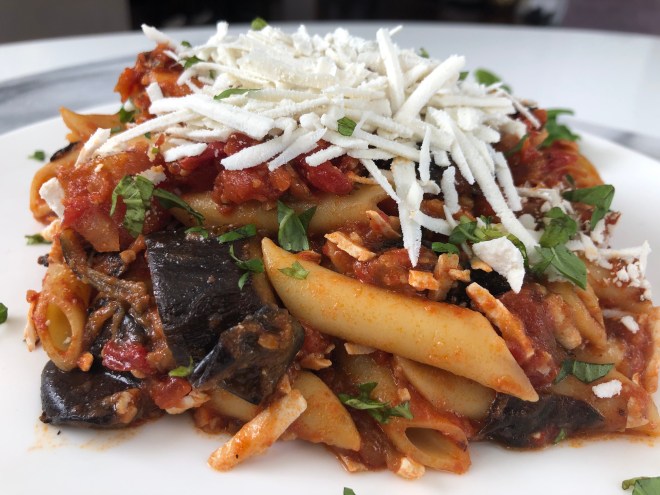 This was one of my favorite things we ate in Sicily. It’s a hearty pasta dish made from fried eggplant and juicy tomatoes, stewed together basil and garlic, and topped with salty ricotta salata. It’s a simple but satisfying meal that vegetarians and carnivores alike will love.