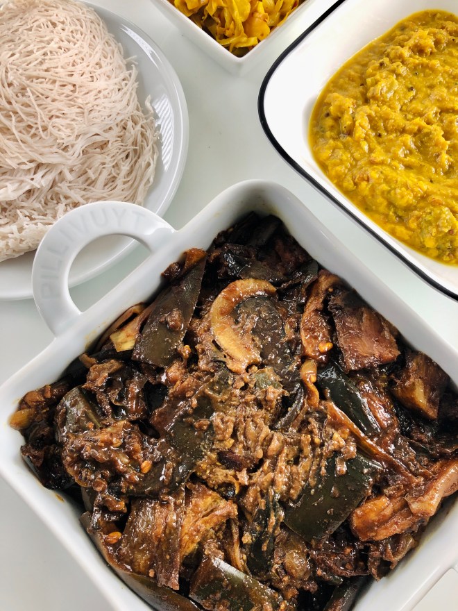 I love eggplant dishes, and this Sri Lankan tamarind eggplant is no exception. I’ve eaten different versions of it at my Sri Lankan friend’s houses and on my Sri Lanka trip in 2018. I’ve savored it every time. It’s a little sweet, salty, tangy, and rich all at the same time.