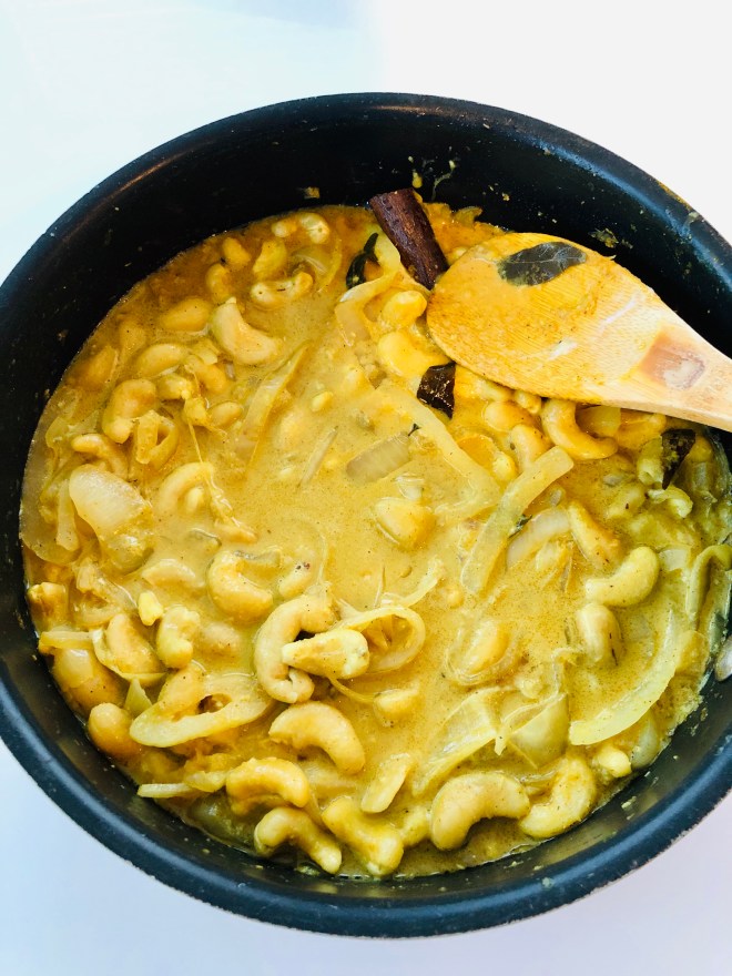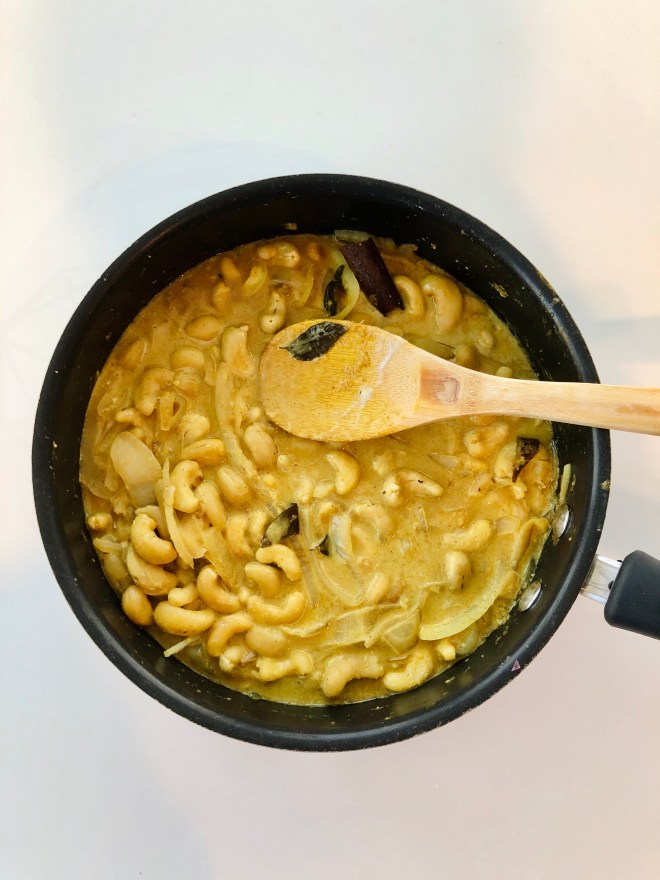 - Add cashews, salt, and coconut milk. Lower heat to simmer and cook covered for another 10 minutes.