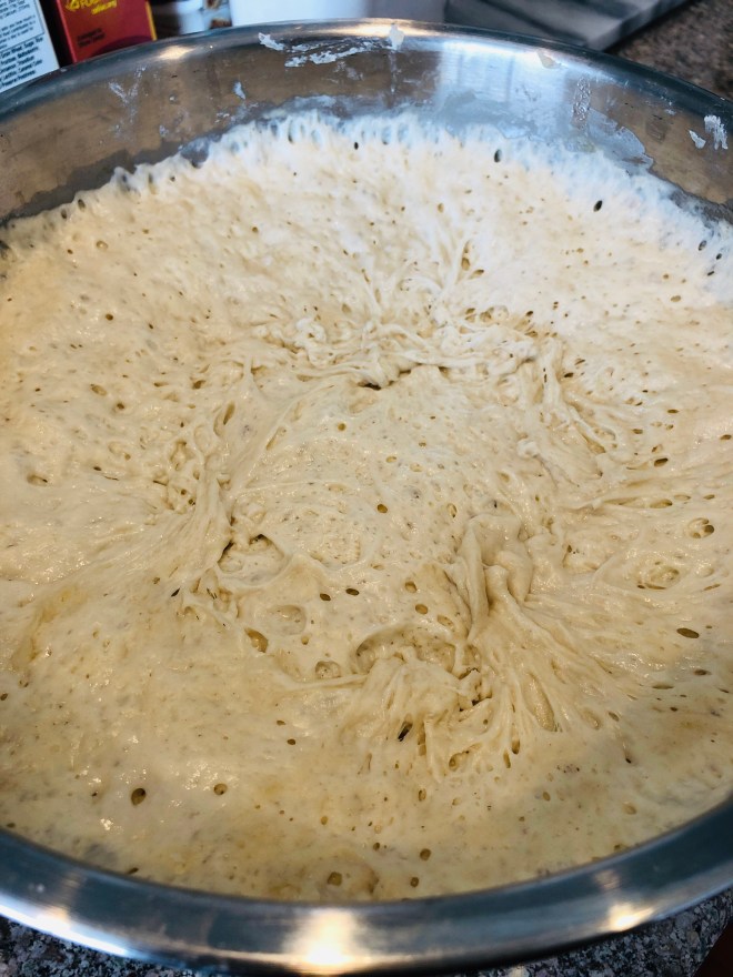 - In a very large bowl, whisk together flour and salt, then add olive oil and honey-yeast mixture. Stir with a rubber or silicone spatula until incorporated. The dough is very sticky; you do not want to use your hands or a wooden spoon, or you’ll lose a lot of dough. Cover with plastic wrap and leave in your oven with the light on for 12 hours. The dough will ferment and double in size.
