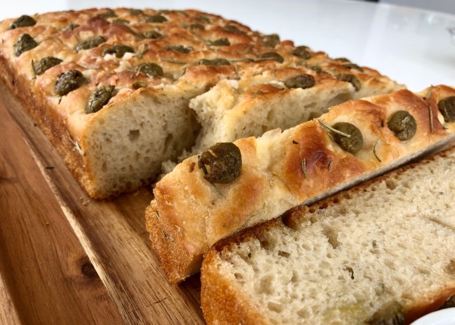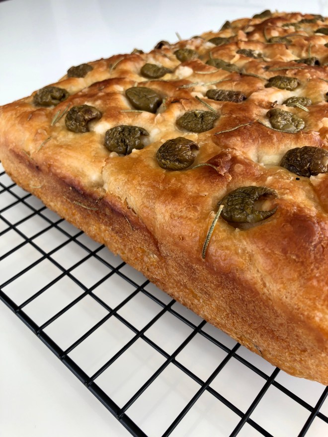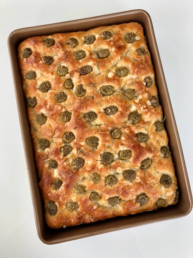 This recipe is a slight adaption of Samin Nosrat’s famous Ligurian focaccia. In addition to adding rosemary and olives, I baked my focaccia in a 9×13 pan instead of an 18×13 inch baking sheet. The result is a thick, soft, fluffy focaccia that’s perfect for snacking or sandwiches.
