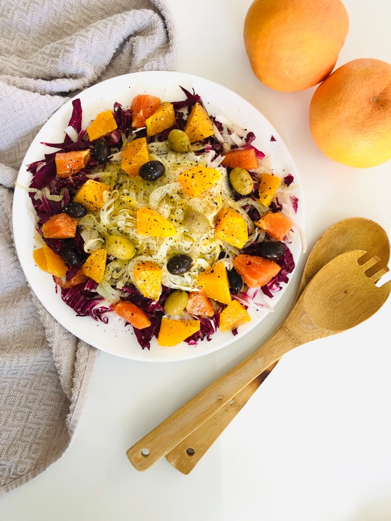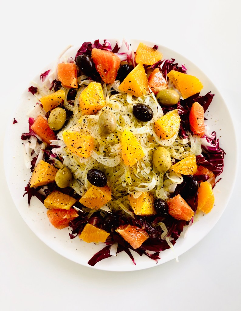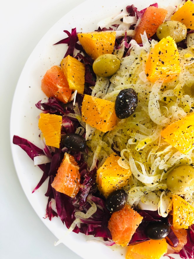 - Compose the salad by layering ingredients on a large plate or in a salad bowl: radicchio, fennel, oranges, and then olives. Drizzle dressing on too, distributing evenly, and serve.