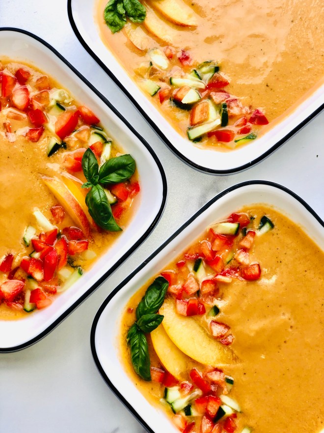 This is a little twist on a classic gazpacho, using ripe summer peaches for a hint of sweetness. Instead of the classic garlic and green bell peppers, I used ginger and sweet red bell peppers. The result is super cooling and refreshing. I love gazpacho as a way to help eat healthy and balance out all the baked goods I make (and eat), and this definitely one hits the spot. As with all gazpachos, this tastes much better the day after you make it.