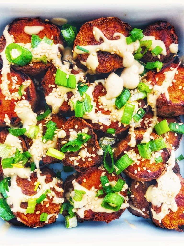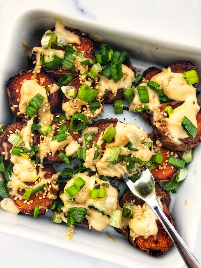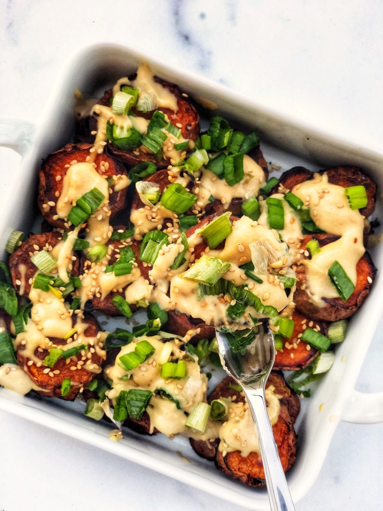 - Remove your potatoes from the oven and let stand for 5 minutes. Drizzle miso-tahini sauce on top and sprinkle on sesame seeds and green onions. Serve.