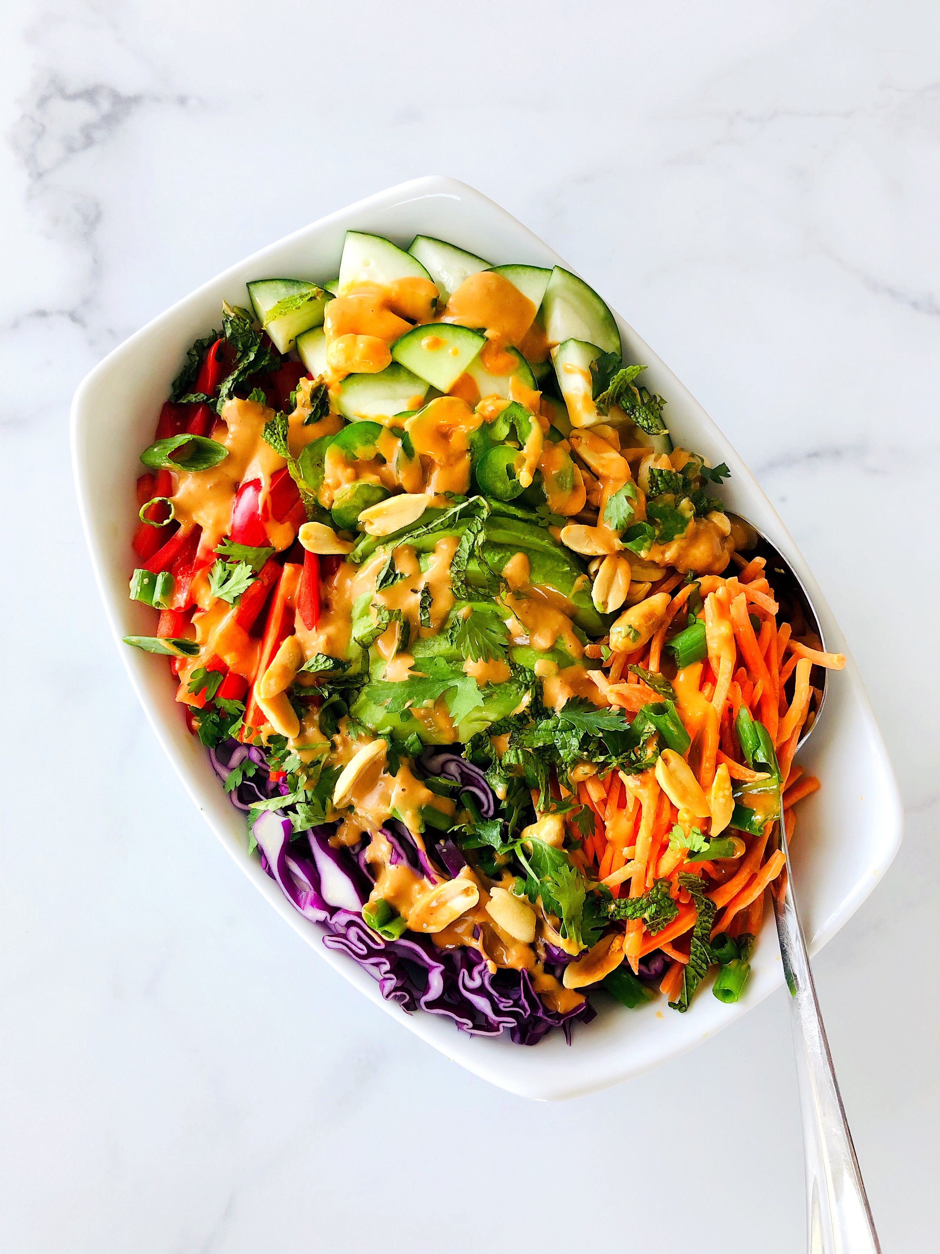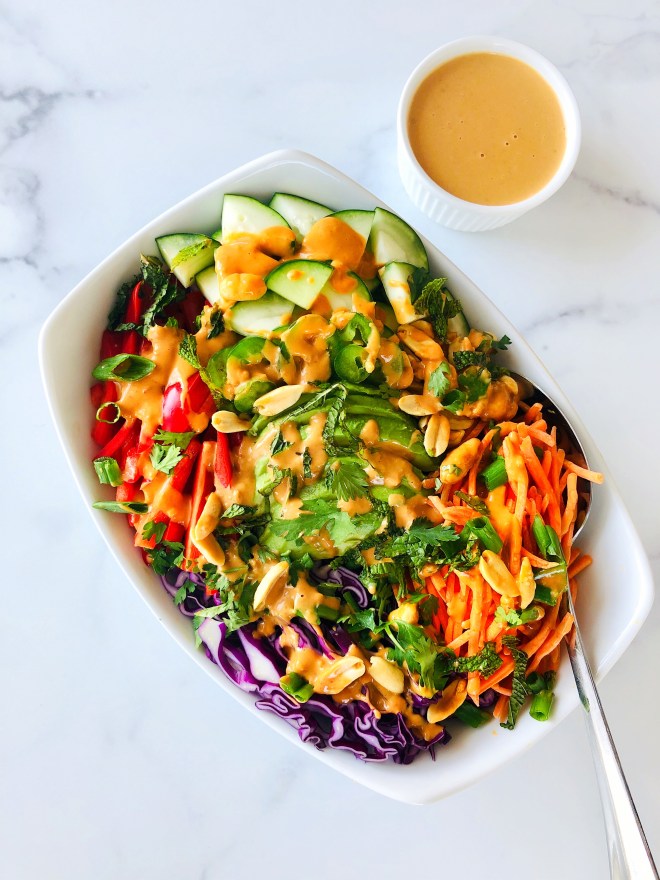 This salad is inspired by the Thai crunch salad at CPK. The best part is the dressing – it’s creamy, spicy, and tangy. Obviously this is not an authentic Thai food recipe. For example, sesame oil is not used in Thai cooking. But a lot of the flavors in the dressing are Thai-inspired: peanut butter, lemongrass, ginger, and soy sauce, not to mention the fresh herbs (mint, cilantro, etc).