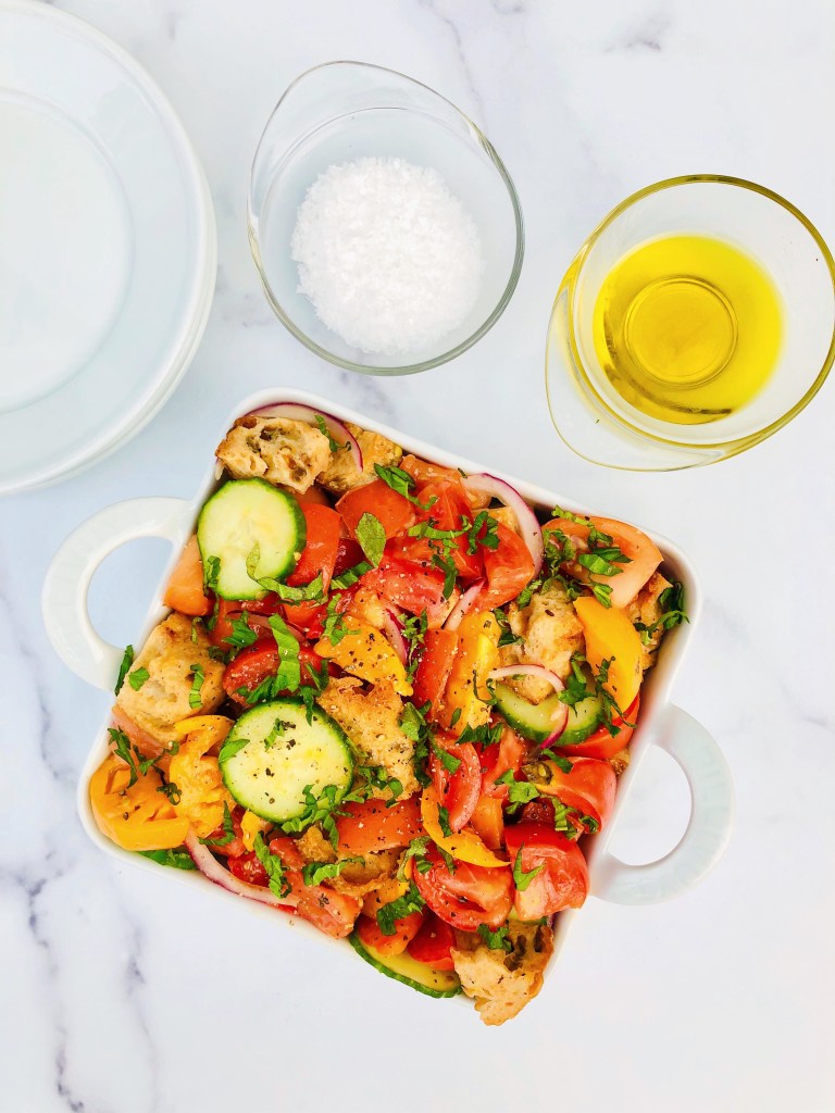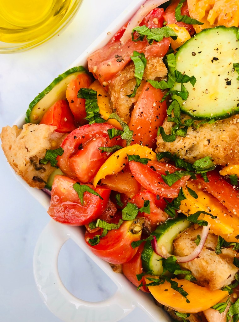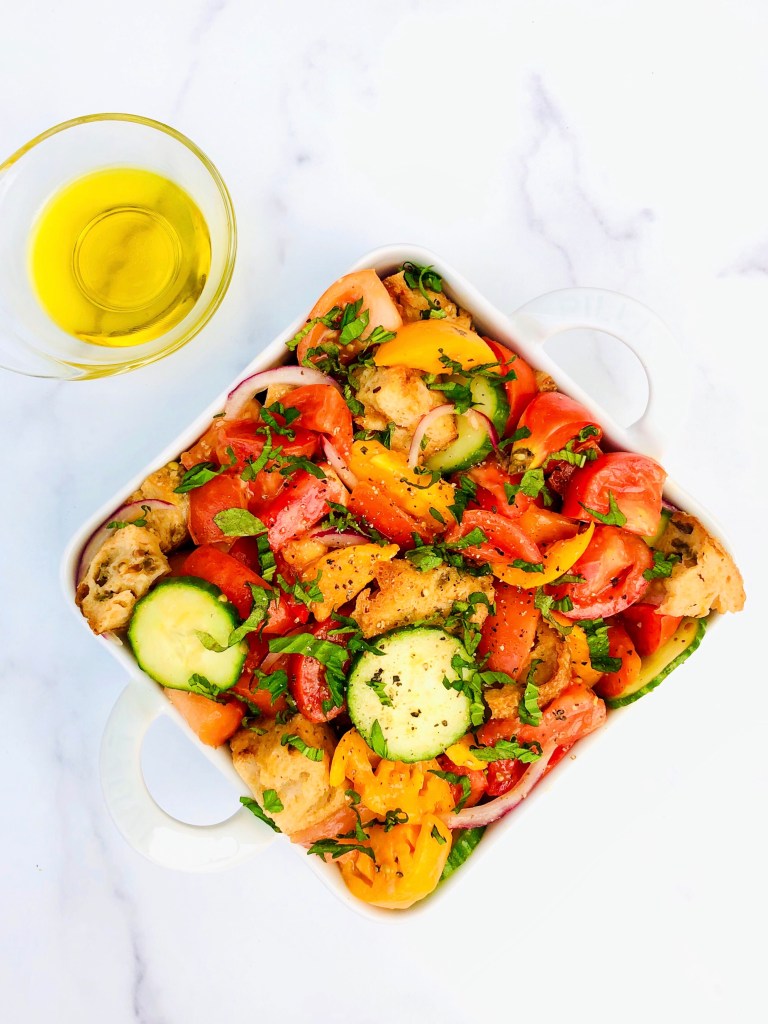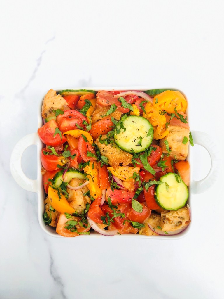 Panzanella is a rustic Italian bread salad. It’s hard not to like a salad that boasts bread as a main ingredient. But the real star of the show is actually the heirloom tomatoes. August is peak tomato season, which means tomatoes are at their sweetest and juiciest.