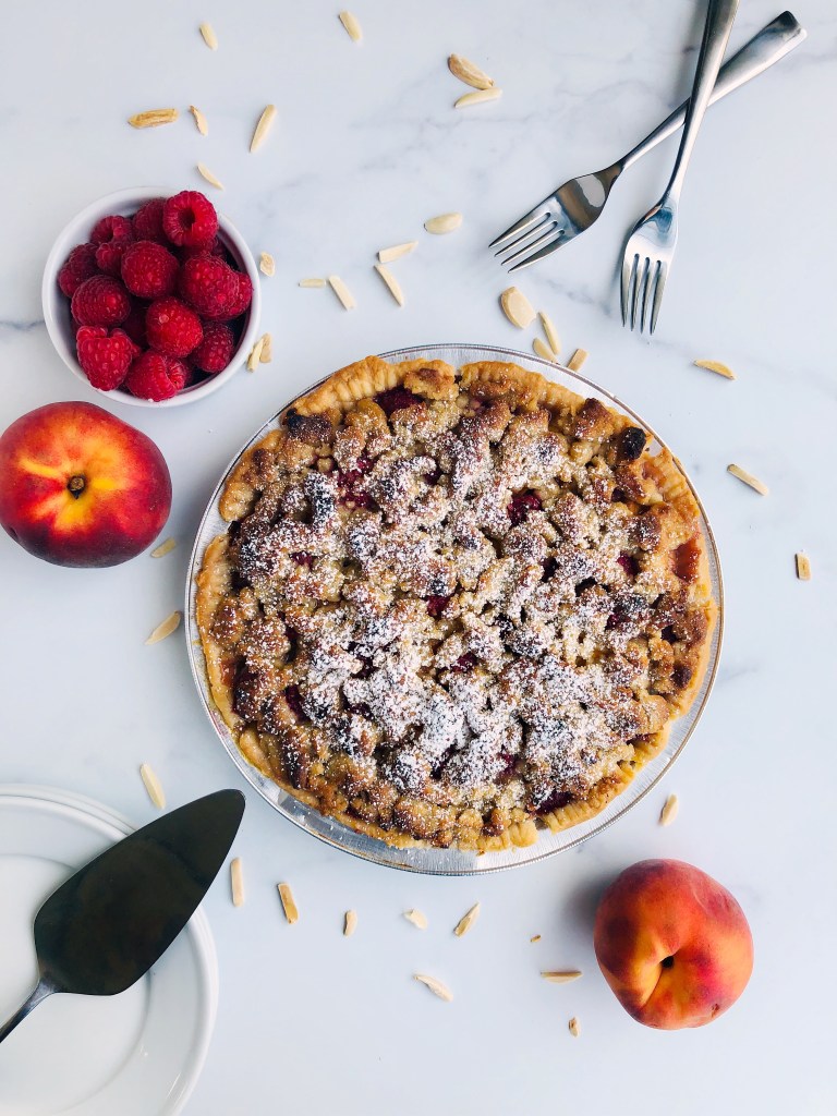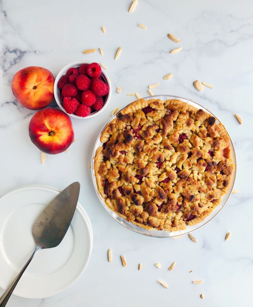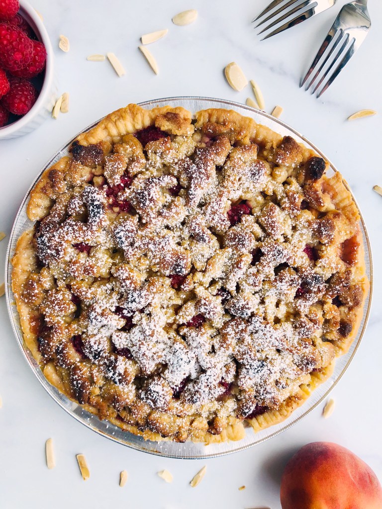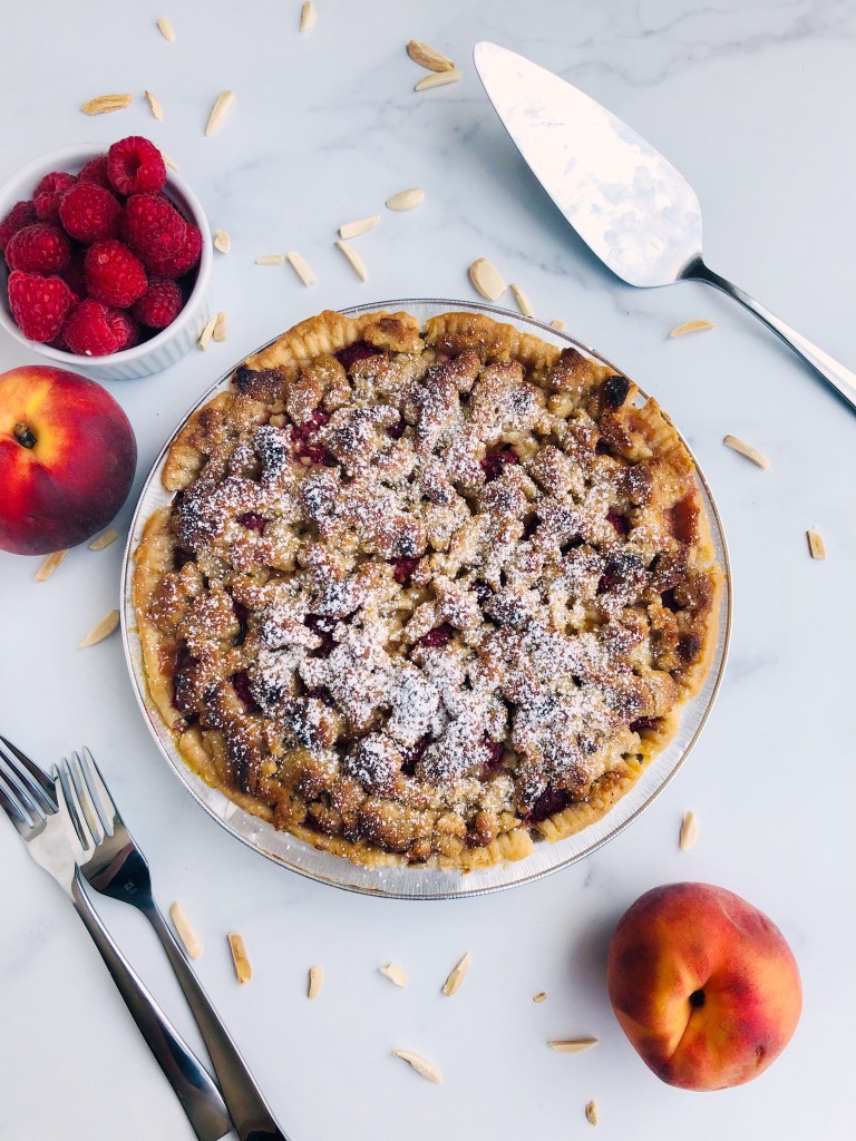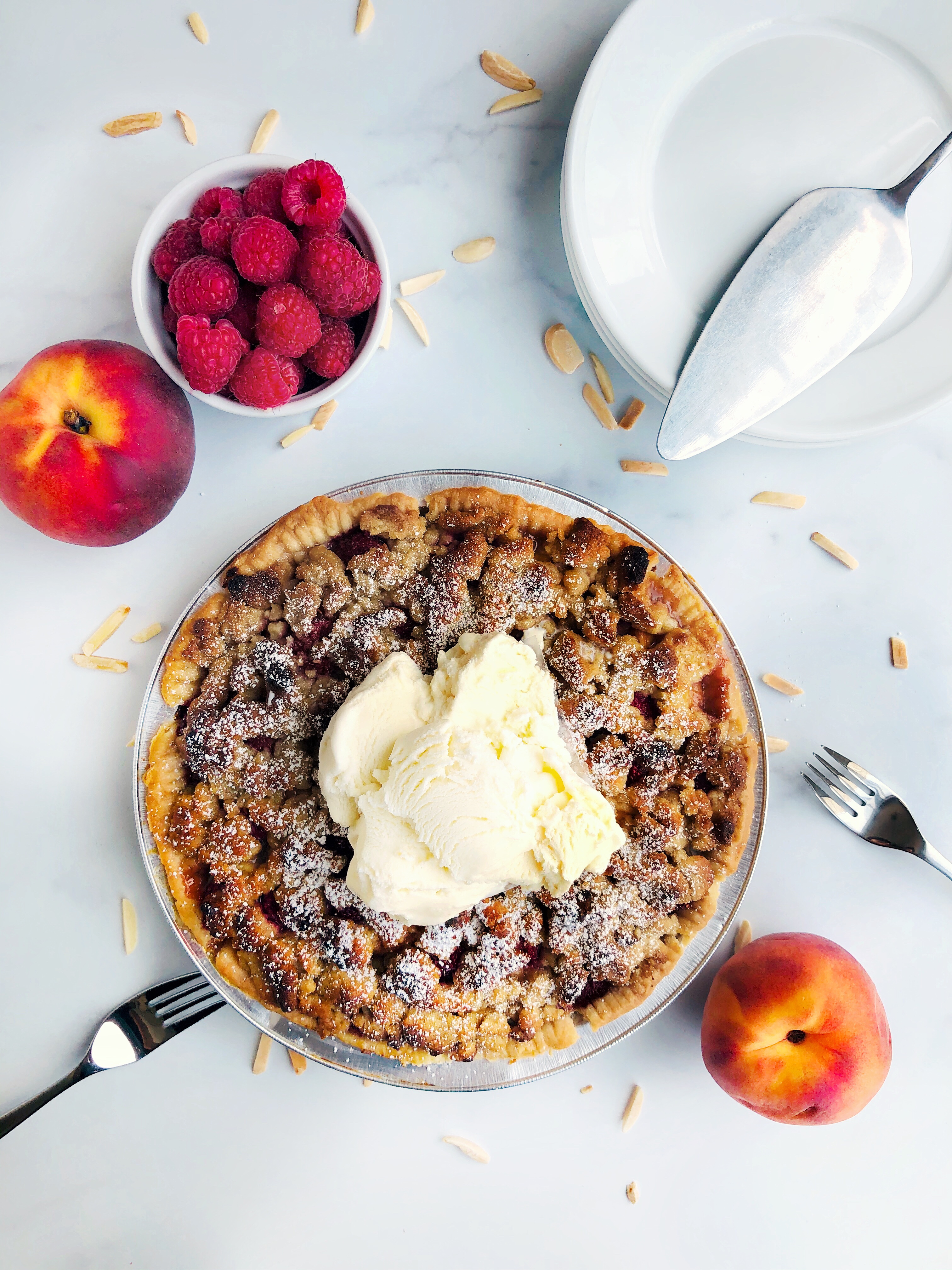 I’m so excited to share the recipe for this pie!! This pie has sweet, juicy peaches, tart raspberries, and a rich, nutty frangipane-like almond crumble on top. Such a great flavor combo!