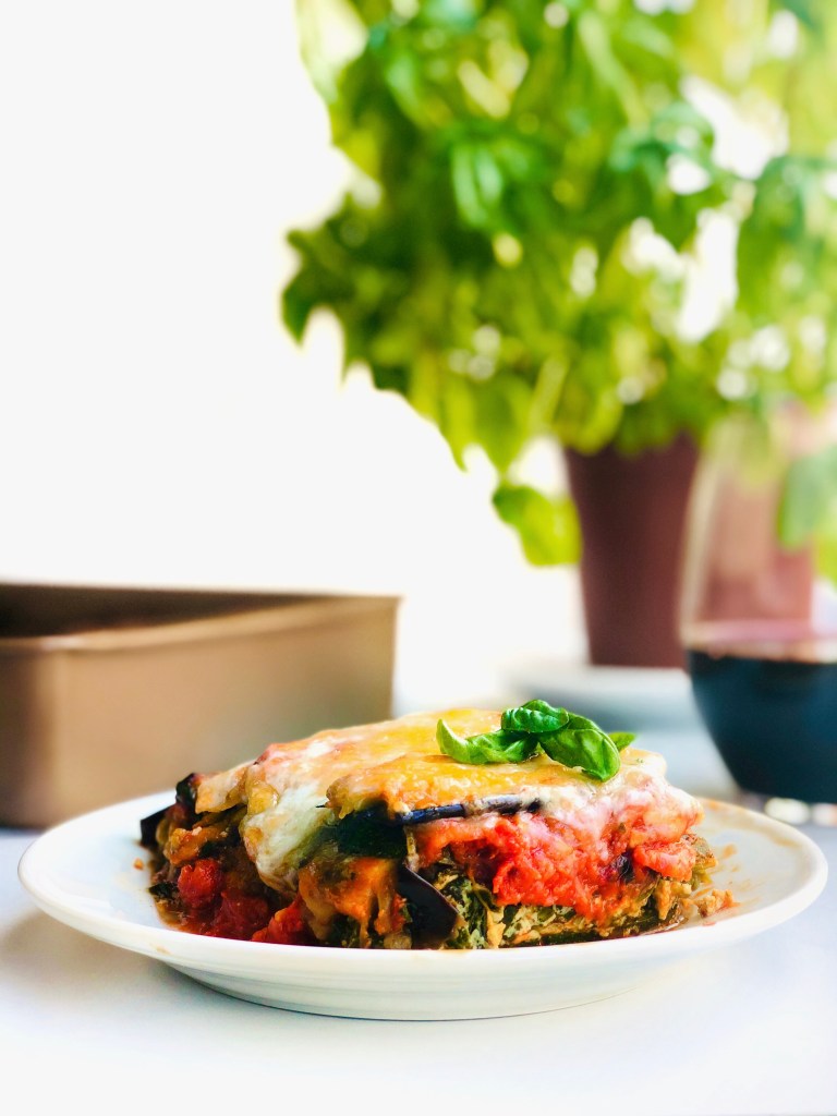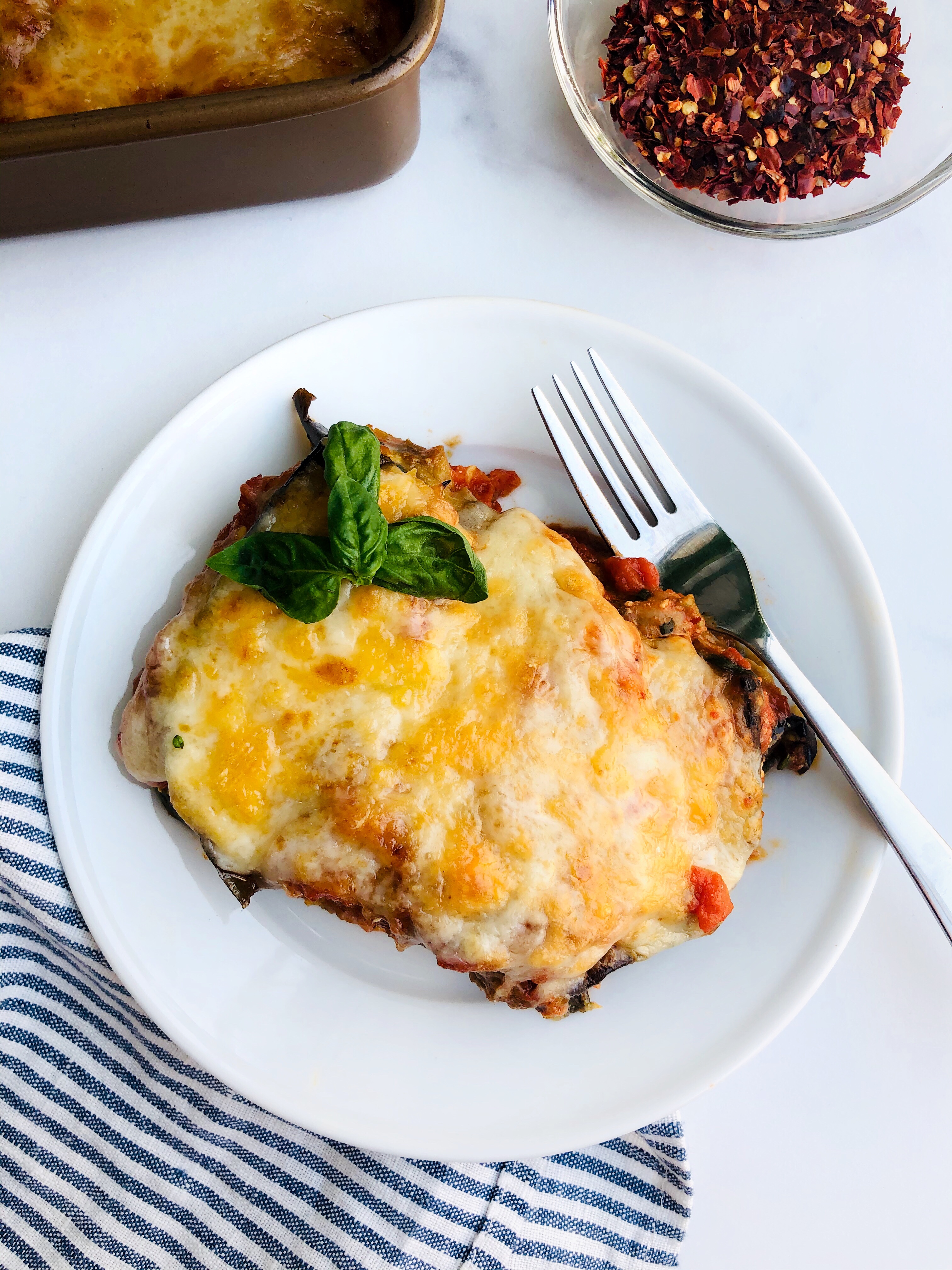 I’ve been trying to experiment with new low carb recipes this month. Not easy, but this is one my husband and I both loved. It has all the delicious cheesy indulgence of a regular lasagna buy with way less carbs. Instead of the typical pasta noodles, you use thinly sliced and toasted eggplant and zucchini. It’s a bit more work than using no bake pasta noodles, but it’s totally worth it. Plus, zucchini and eggplant are both plentiful and delicious in September, so now is the perfect time to try this recipe!