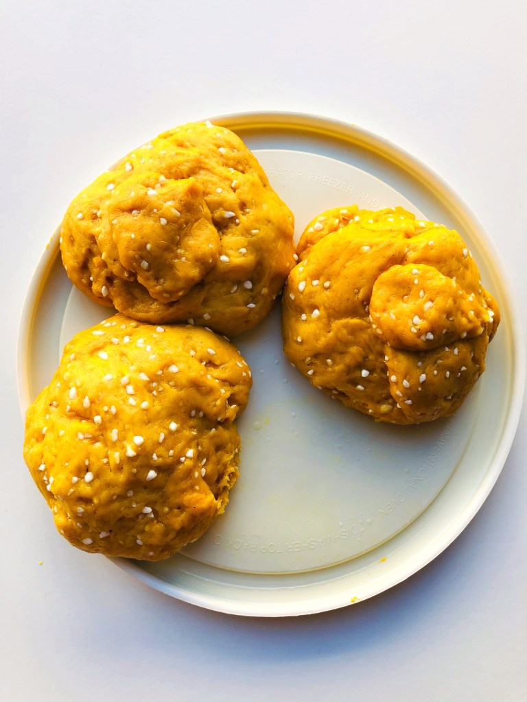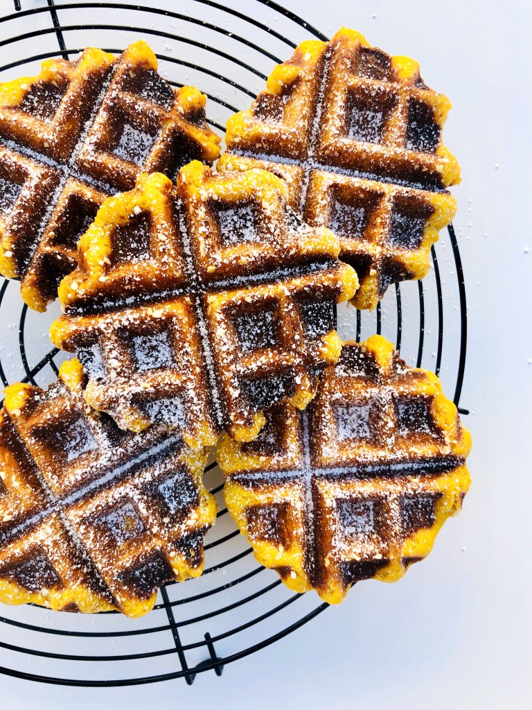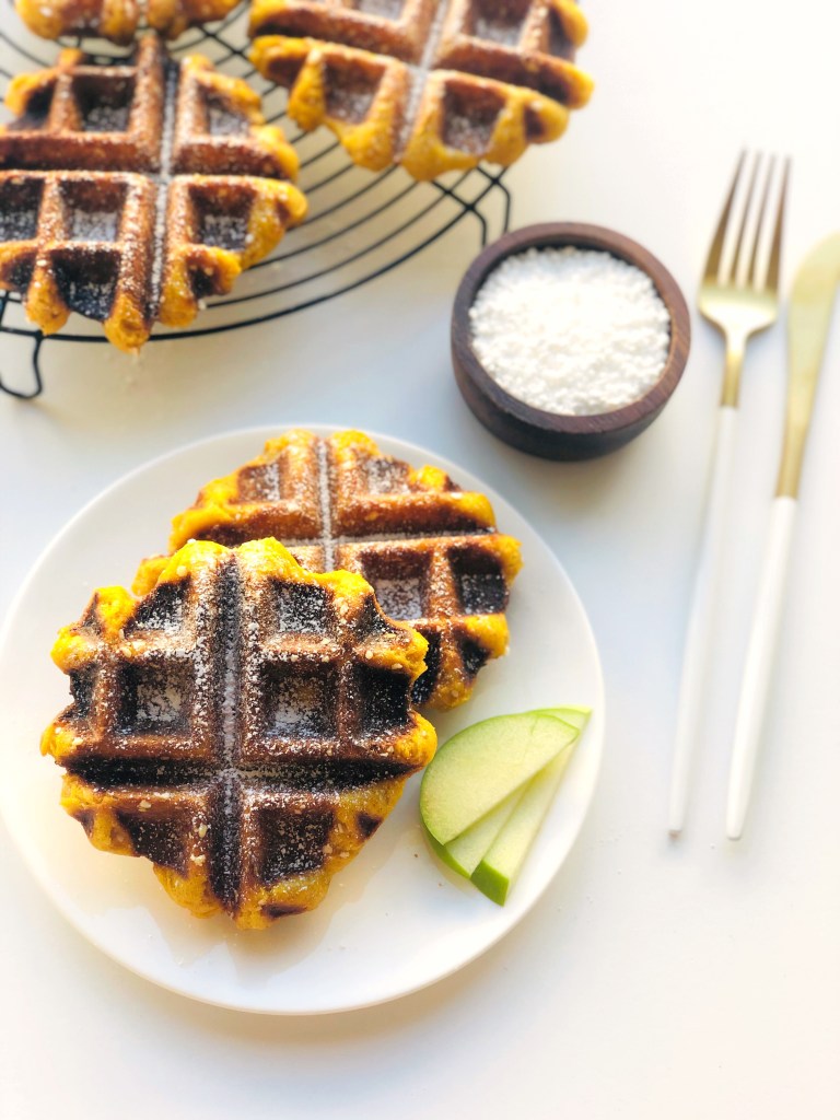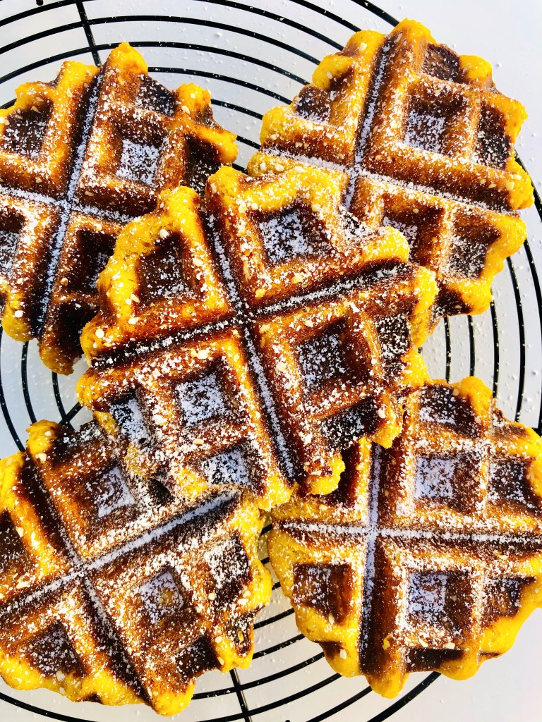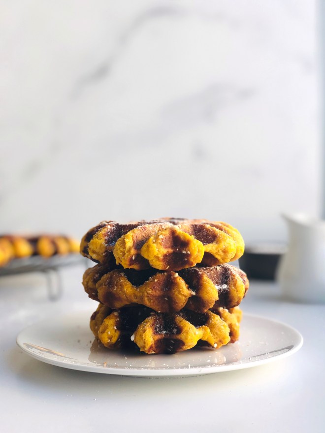 Liege waffles are usually made with eggs, but since I was craving something with pumpkin and since I’ve often successfully used pumpkin + baking powder as an egg substitute in cake, I tried it here. I also subbed cinnamon and nutmeg for the vanilla and halved the recipe.