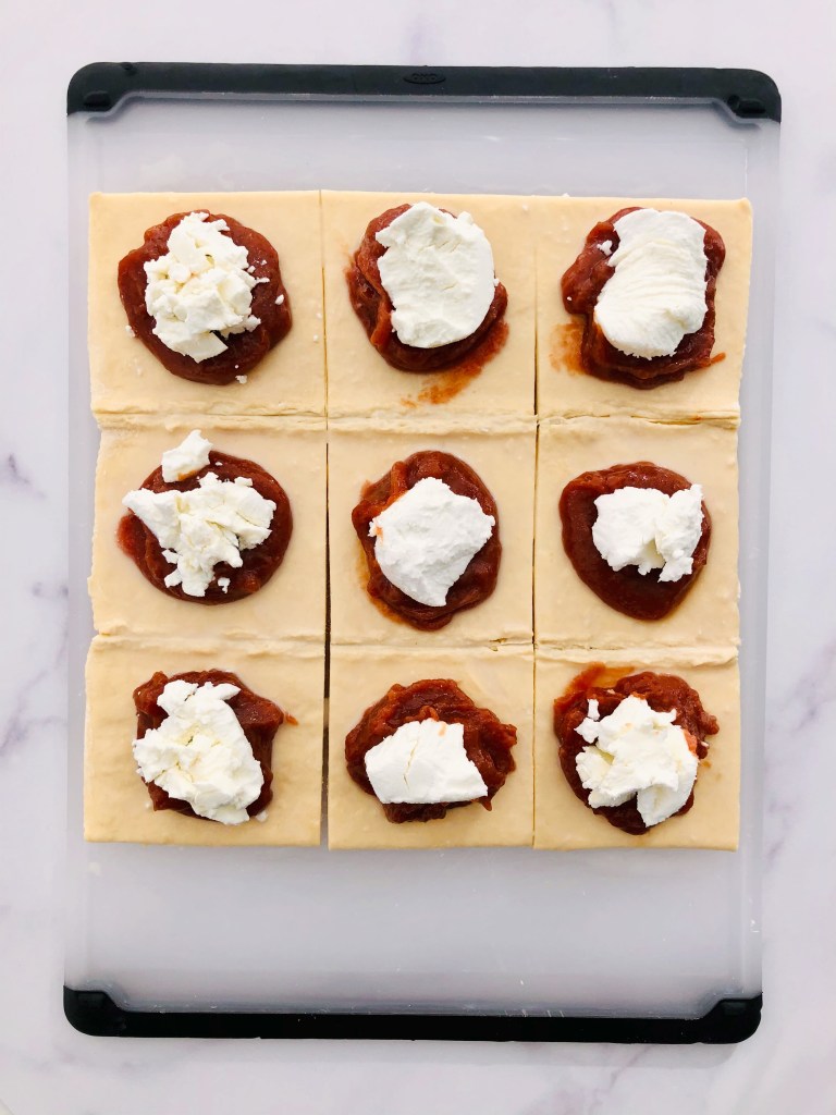 - On 9 of the rectangles, place 1 tablespoon of guava purée in the center, leaving 1/2 inch of dough around the edges. Top with a teaspoon of goat cheese and a teaspoon of manchego cheese.