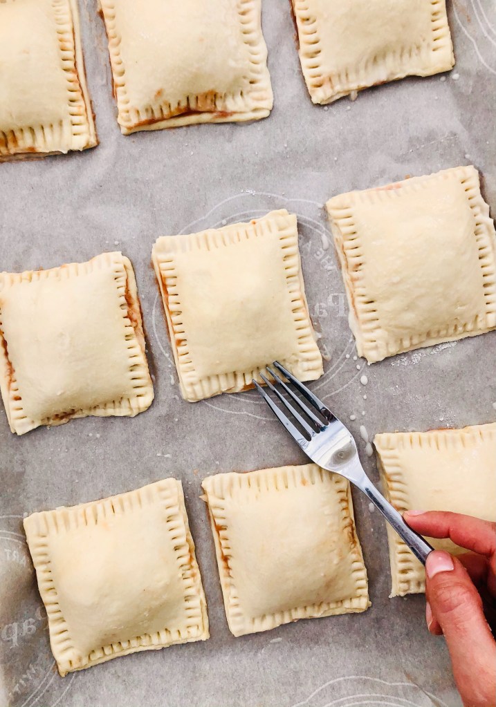 - Place an unused rectangle of dough on top of each of the rectangles with filling. Seal the edges using your fingertips. Note, this may get a little messy, as you may have some filling spilling out. Don’t sweat it – just wipe it or remove the excess with a spoon. Crimp the edges of each pastry lightly with a fork.