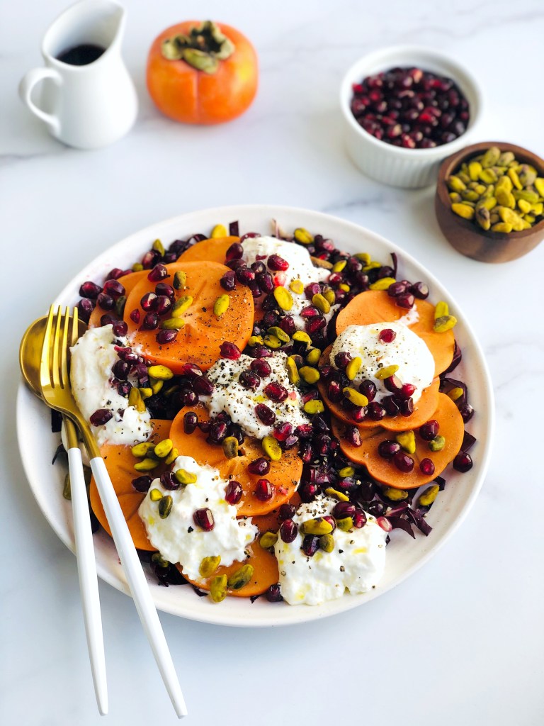 This simple yet sophisticated salad will bring a little something special to your dinner table. It’s got a little of everything – sweetness from the persimmons, tanginess from the pomegranate, crunch from the pistachios, a creamy lusciousness from the burrata, and just a touch of bitterness from the radicchio. Serve by itself or with a side of crusty crostini!