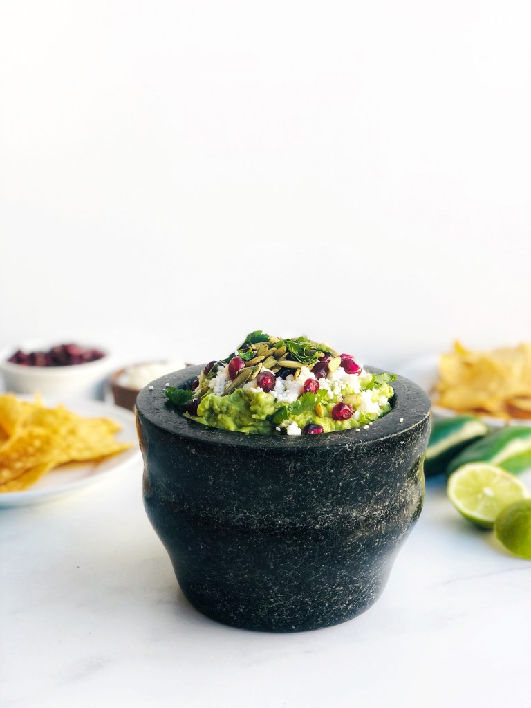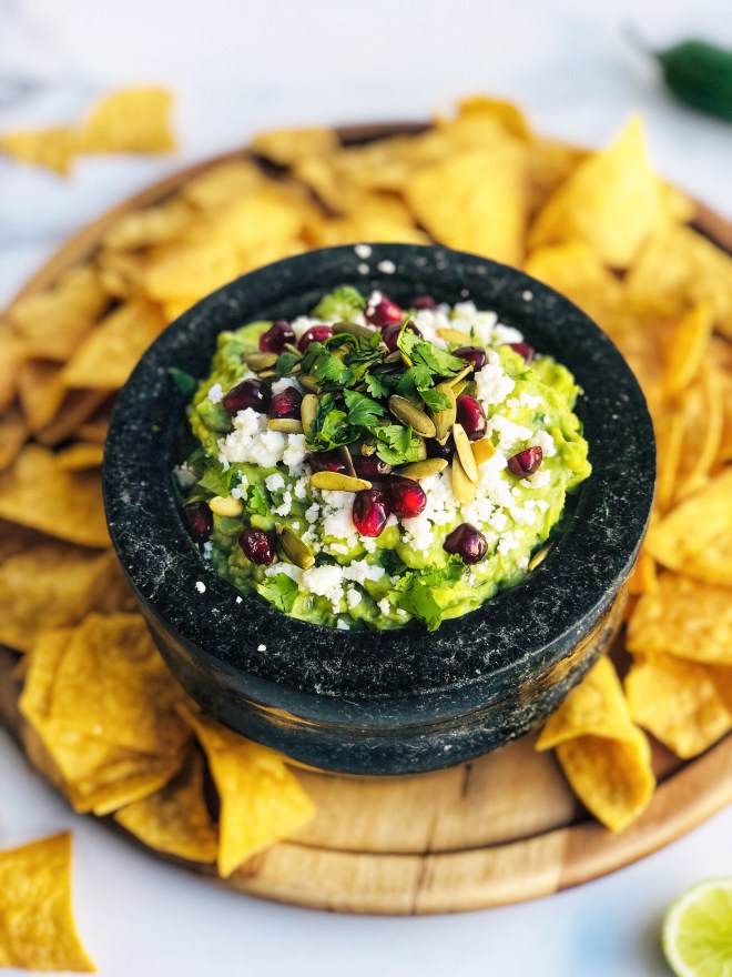 - Spoon guac into a serving dish. I used a molcajete. Just before serving, sprinkle the cotija cheese on top of the guacamole, then the pomegranate seeds, then the pumpkin seeds. Sprinkle more cilantro on top if desired. Enjoy!